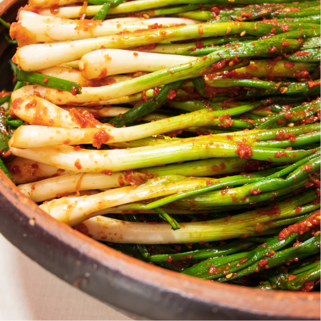 파김치의 주재료인 쪽파는 황화 알릴 성분이 풍부하여 소화액 분비를 촉진하고 항균작용을 돕습니다. 위의 더부룩한 증상을 개선하는 데 효과적이며, 줄기 부분의 엽록소는 구강 세균을 억제하고 염증을 중화시키는 역할을 합니다.