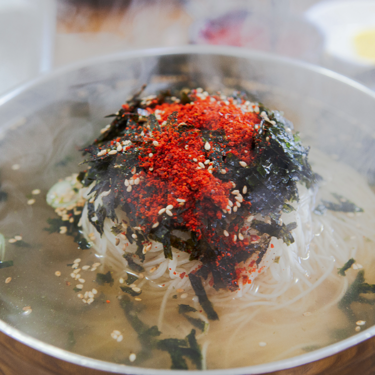 찬물에 씻은 면이 너무 차가우면 육수 온도가 떨어지므로, 마지막에 따뜻한 물을 한 번 끼얹어주면 좋습니다.