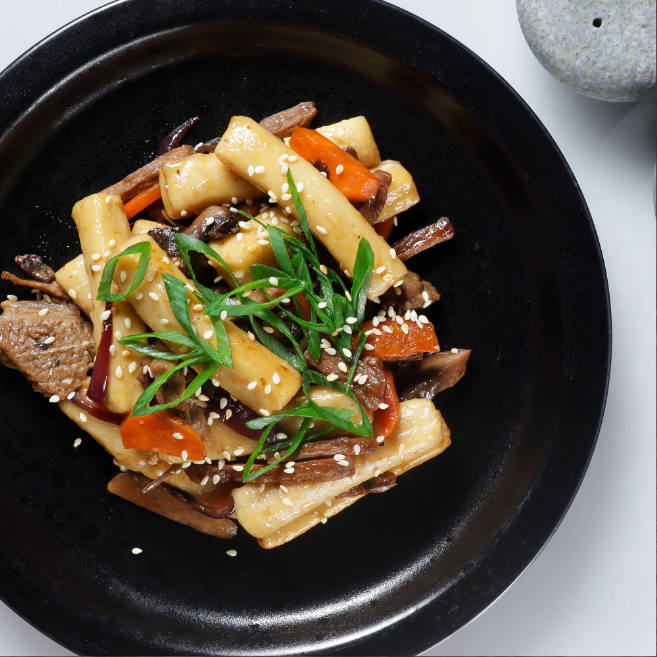궁중떡볶이의 핵심 재료는 소고기 등심입니다. 양질의 동물성 단백질이 풍부하게 들어 있습니다.